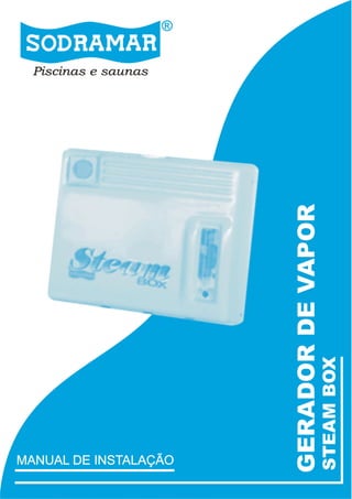 O documento fornece instruções para instalação e uso de um gerador de vapor Steam Box. Explica como fixar o aparelho na parede do box, conectar a eletricidade e operá-lo para fornecer vapor para banho de sauna em casa. Também fornece especificações técnicas e detalhes sobre a garantia do produto.