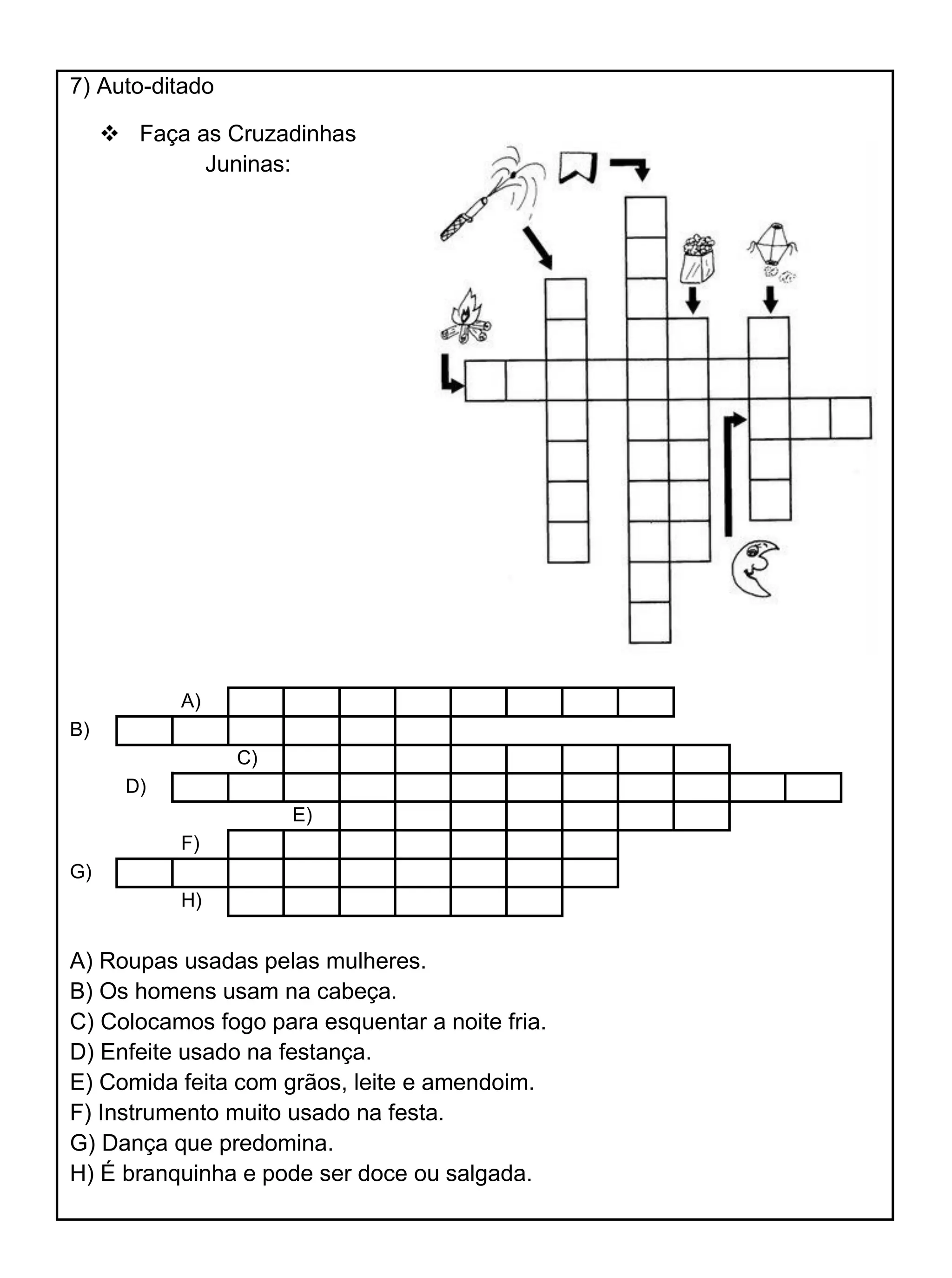 Este documento fornece uma lista de itens relacionados às Cruzadinhas Juninas, incluindo roupas femininas, enfeites usados, comidas típicas e danças populares. Ele contém 8 itens com letras de A a H e pede para associar cada letra a uma descrição correspondente.
