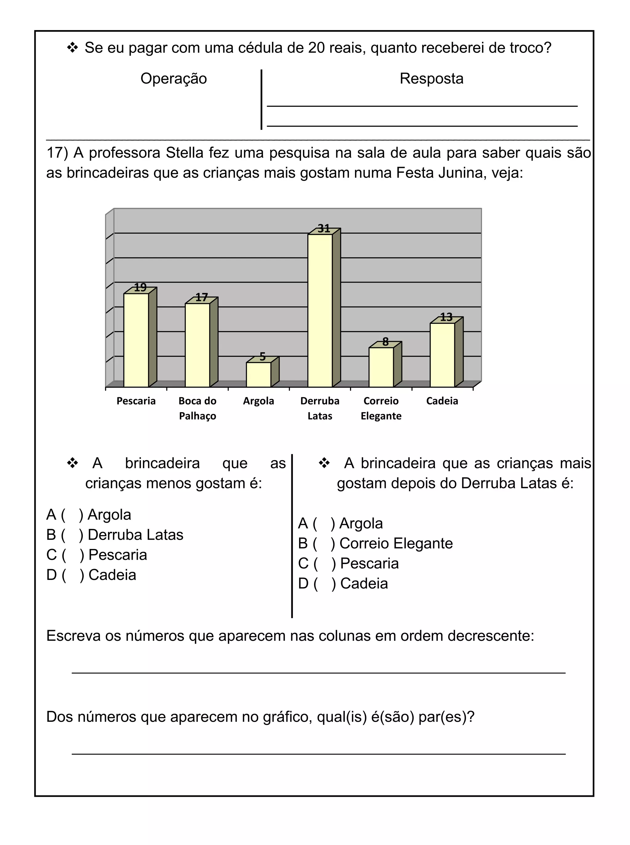 A professora Stella fez uma pesquisa com crianças sobre brincadeiras preferidas de Festa Junina. A brincadeira menos popular foi Argola, enquanto a mais popular depois de Derruba Latas foi Correio Elegante. O gráfico mostra os números de preferência de cada brincadeira.