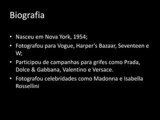 • Fotografou para Vogue, Harper's Bazaar, Seventeen e