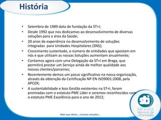 O documento apresenta a STI Saúde, uma empresa com mais de 20 anos de experiência no setor de saúde, que oferece soluções integradas inovadoras para instituições de saúde, especialmente no segmento de oncologia. A empresa utiliza uma arquitetura técnica avançada e fornece uma gama de módulos que otimizam o circuito do medicamento e a logística hospitalar. Além de soluções tecnológicas, a STI Saúde se destaca pelo suporte ao cliente e colaboração com seus parceiros.