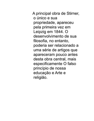 A principal obra de Stirner, o único e sua propriedade, foi publicada em 1844 e apresentou sua filosofia anarquista individualista. Seus artigos anteriores como O falso princípio de nossa educação e Arte e religião começaram a desenvolver estas ideias e criticar a sociedade existente.