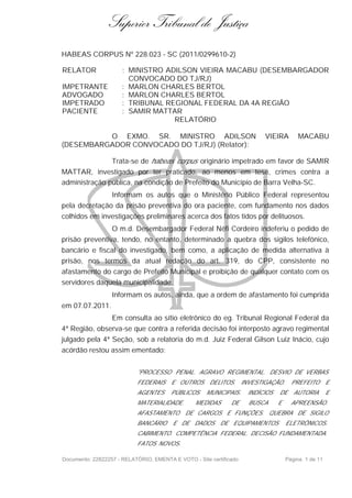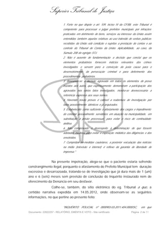 O documento trata de um habeas corpus impetrado em favor de Samir Mattar, prefeito investigado por crimes contra a administração pública. O relator negou liminarmente o pedido inicial, mas reconsiderou parcialmente admitindo o processo. Após quase um ano de investigação sem conclusão do inquérito ou denúncia, o relator entendeu configurado excesso de prazo no afastamento do prefeito do cargo, concedendo parcialmente o habeas corpus.