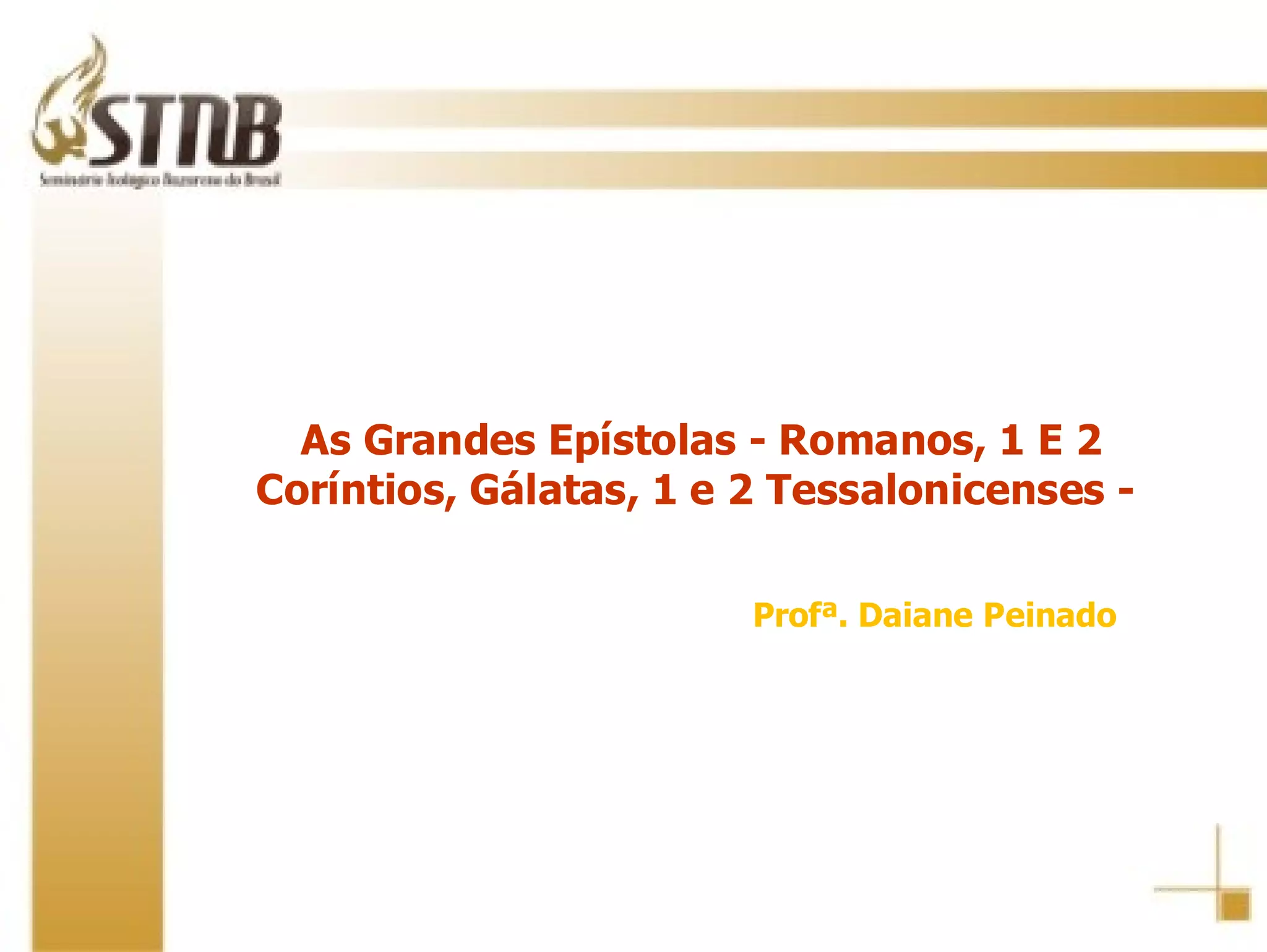 O documento discute as Grandes Epístolas de Paulo - Romanos, 1 e 2 Coríntios, Gálatas e 1 e 2 Tessalonicenses. Ele descreve o contexto histórico e destinatários de cada carta, assim como seus temas principais, que incluem a justificação pela fé, liberdade cristã e a segunda vinda de Cristo.