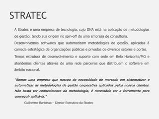A Stratec é uma empresa de tecnologia que desenvolve softwares para automatizar metodologias de gestão em organizações públicas e privadas. Seu produto principal, a Matriz Orçamentária, permite o controle e análise do orçamento, suporte à gestão estratégica e operacional, com funcionalidades como acompanhamento de desempenho e geração de relatórios. Com uma base diversificada de clientes, a Stratec busca sistematizar a gestão orçamentária através de uma abordagem matricial, facilitando a identificação e correção de desvios orçamentários.