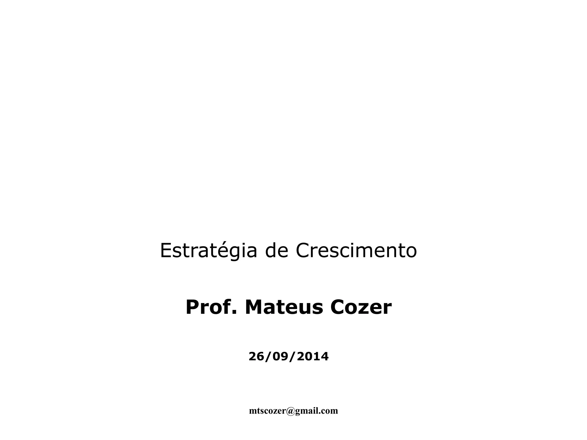 Este documento discute estratégias de crescimento e formulação de estratégia. Apresenta conceitos como estratégias genéricas de Michael Porter, movimentos estratégicos, capitalismo de laços e portfólio de planos de negócios. Fornece exemplos de empresas como a Microsoft e a GE.