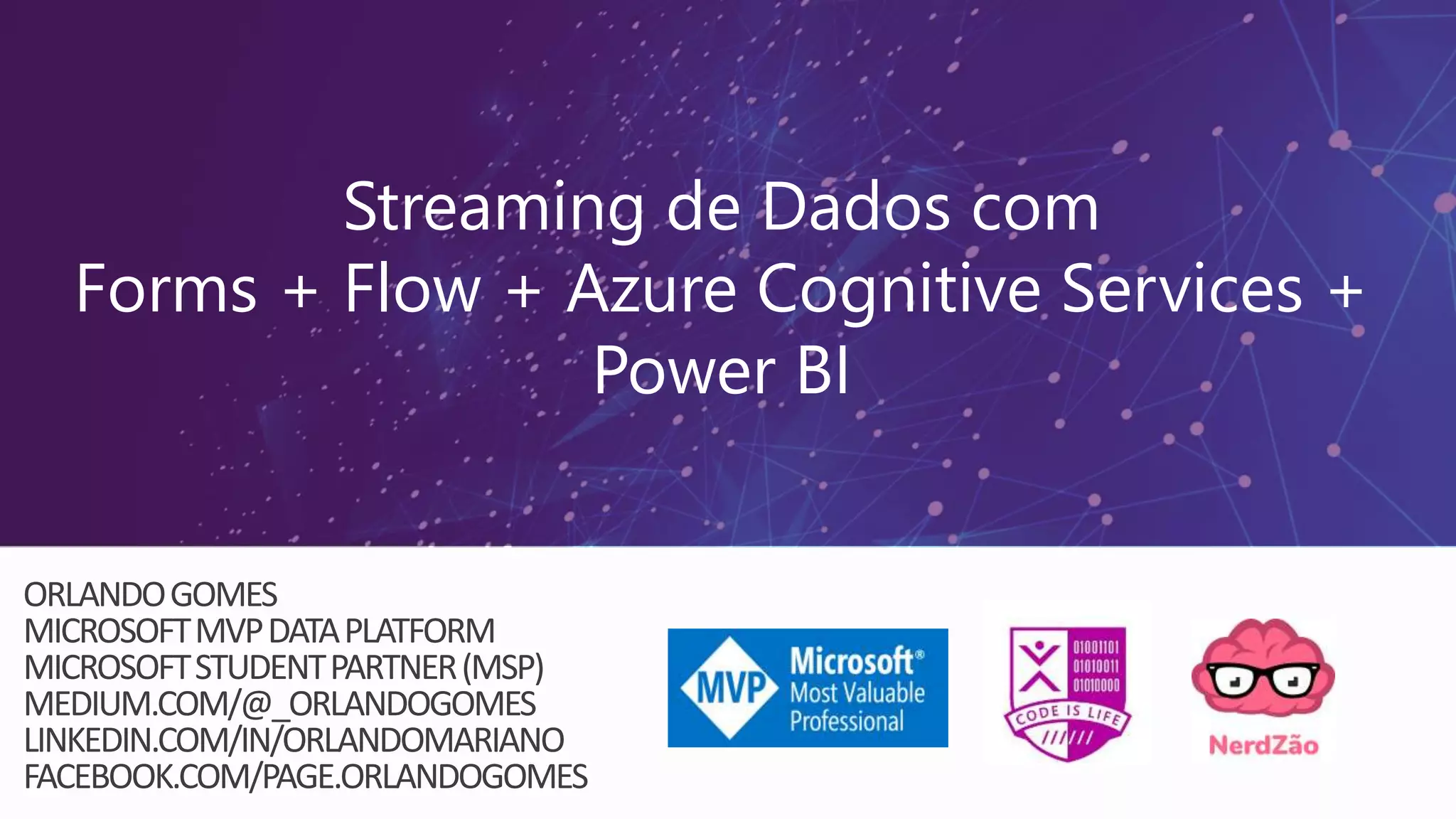 O documento apresenta uma proposta de streaming de dados utilizando Microsoft Forms, Flow, Cognitive Services e Power BI. O resumo inclui uma breve descrição de cada ferramenta e como elas podem ser integradas para automatizar a coleta e análise de dados. Uma demonstração ilustra como o fluxo de trabalho funciona na prática.