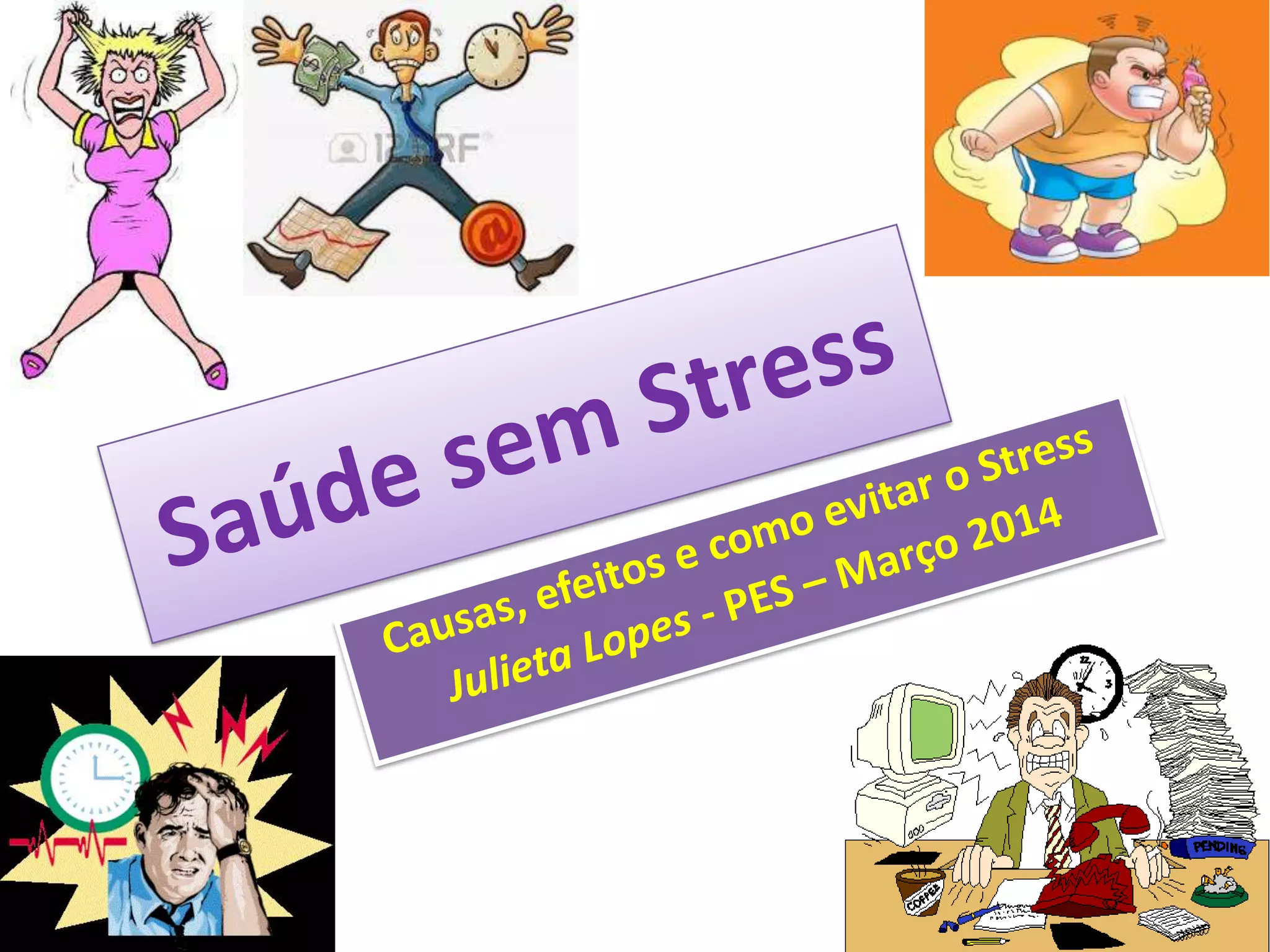 Stress é a resposta do corpo a estímulos ameaçadores que ativam hormônios como adrenalina. Problemas de saúde, gravidez, filhos problemáticos, desemprego e baixa autoestima podem causar stress. O stress pode levar a aumento de batimentos cardíacos, AVC, depressão e até morte nos casos graves. Praticar esportes, ter boas relações e cuidar da saúde pode ajudar a evitar o stress.