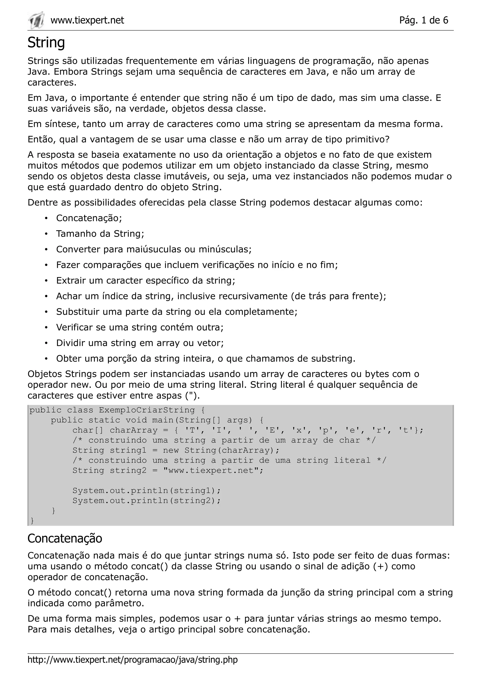 O documento descreve as principais funcionalidades da classe String em Java, incluindo métodos para concatenar, comparar, dividir e extrair substrings de objetos String. Alguns dos métodos mais importantes são length(), equals(), compareTo(), indexOf(), replace() e substring().