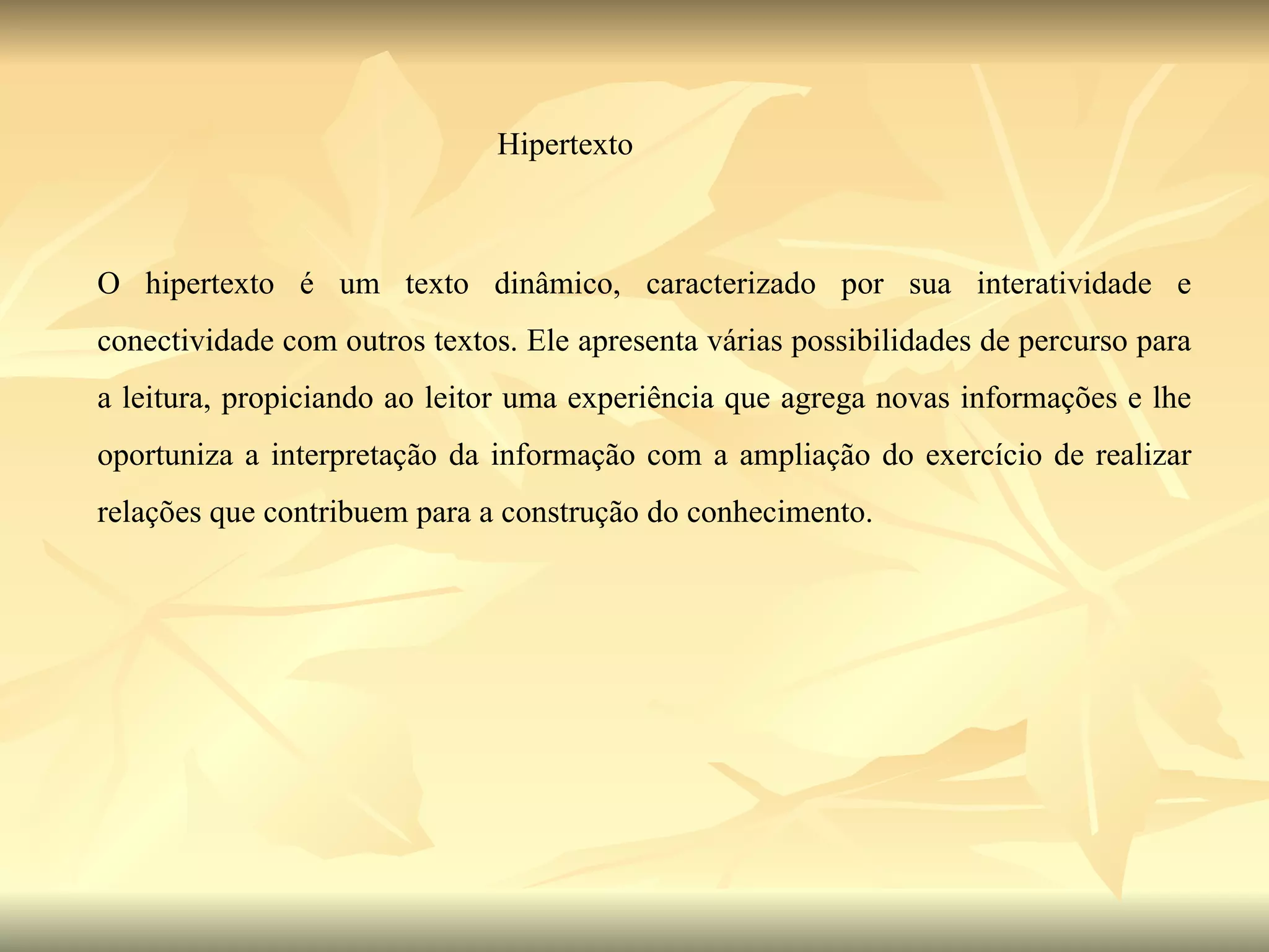 O documento discute hipertexto, que é um texto dinâmico e interativo que permite múltiplas rotas de leitura, agregando novas informações e permitindo que o leitor construa conhecimento fazendo conexões. O documento também menciona parcerias entre escola e família, avaliação docente, e o uso de tecnologias de informação no desenvolvimento contínuo de professores.