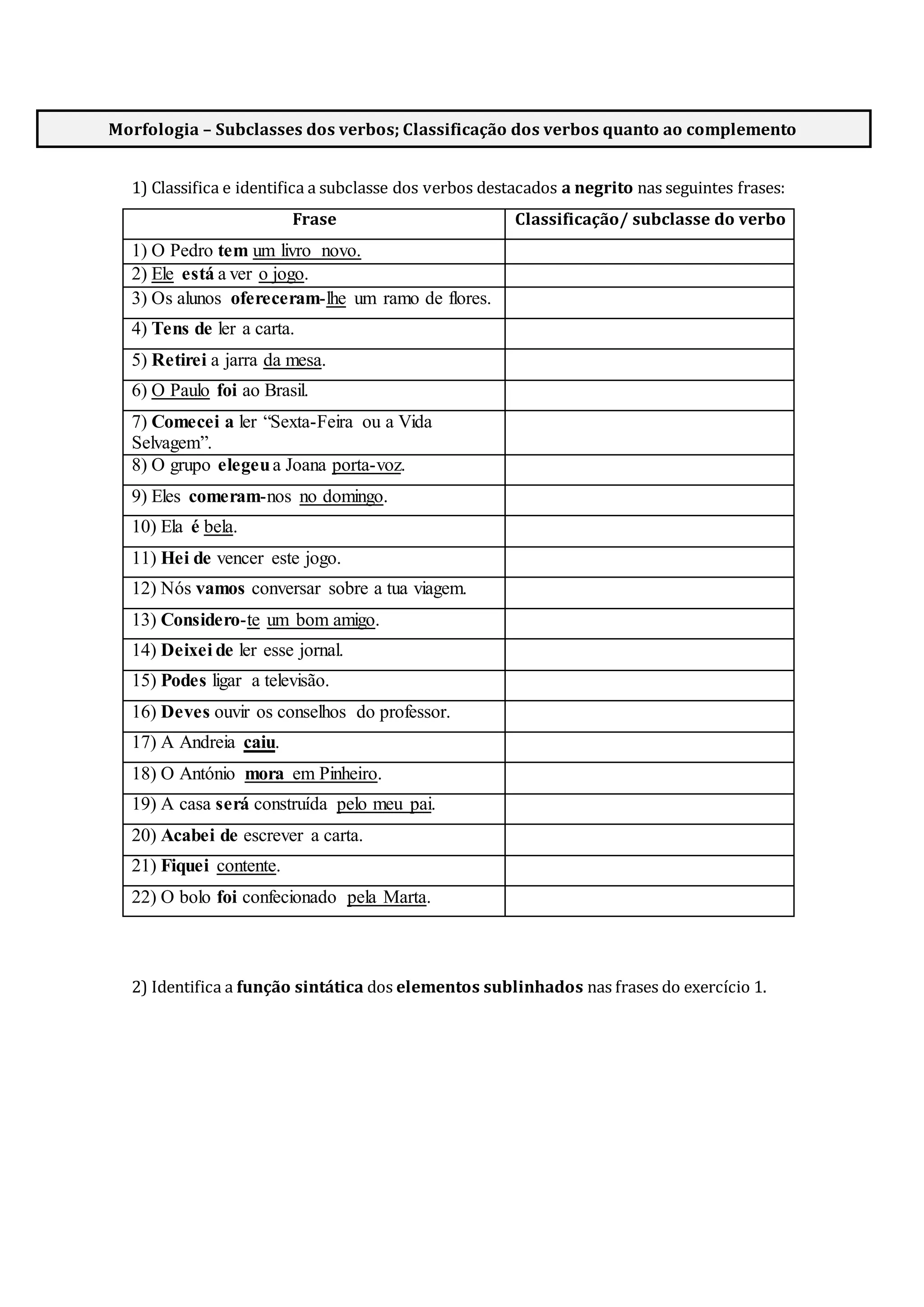 O documento classifica e identifica subclasses de verbos em frases. A primeira parte classifica 22 verbos em frases segundo sua subclasse como transitivo, auxiliar, copulativo ou intransitivo. A segunda parte identifica a função sintática de elementos sublinhados nas mesmas frases como sujeito, objeto direto ou indireto.