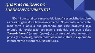 O documento discute o subdesenvolvimento no Brasil, mostrando como a desigualdade social, representada por favelas ao lado de prédios luxuosos em São Paulo, é um sinal do subdesenvolvimento. A professora Vanise Feitosa apresenta o tema do subdesenvolvimento para a prova do ENEM de 2020.