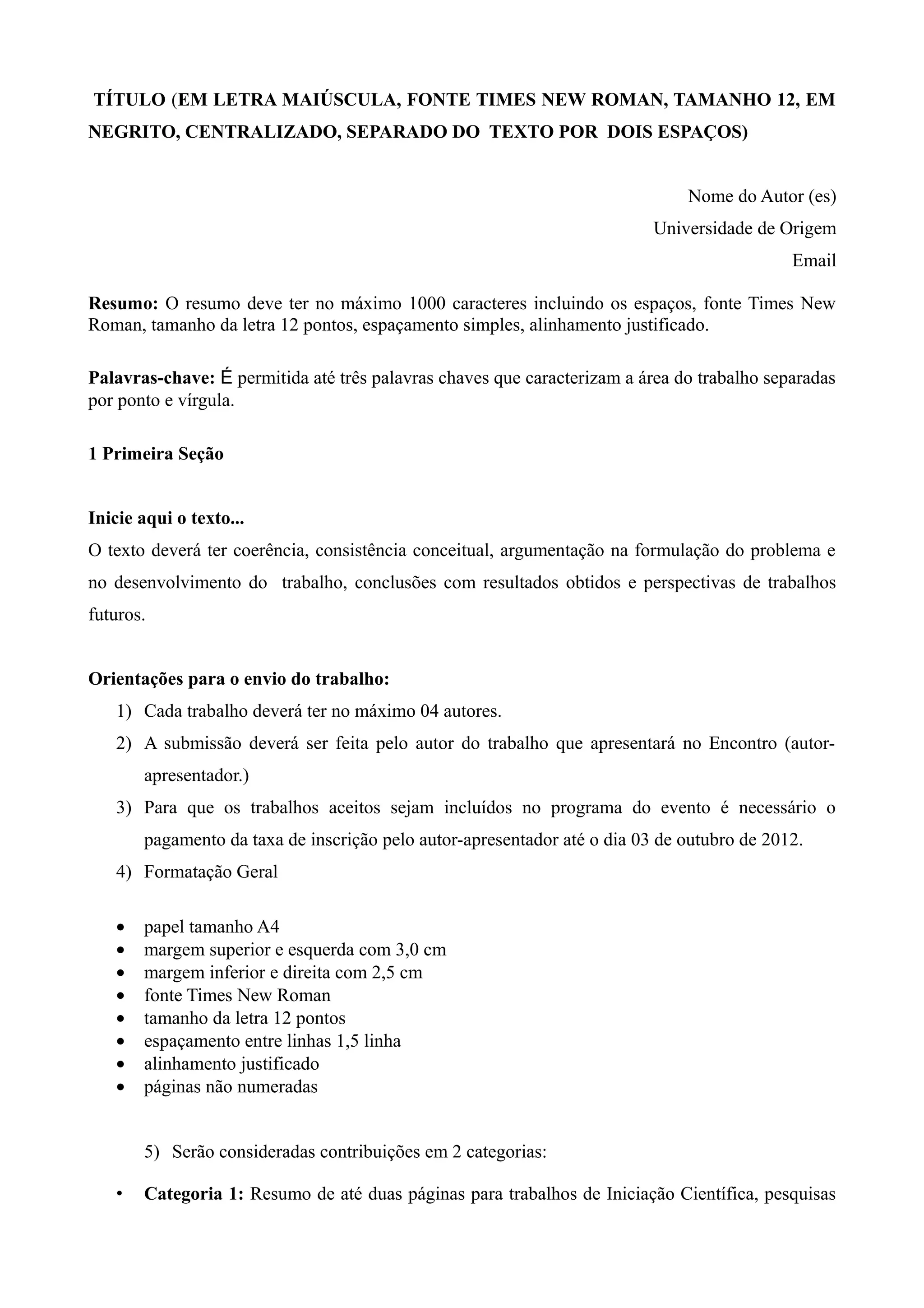 Este documento fornece instruções para a submissão de trabalhos acadêmicos para um encontro sobre ciência e tecnologia. Deve conter título, nome do autor, resumo em até 1000 caracteres, palavras-chave, seções de conteúdo, referências e orientações de formatação. Os trabalhos serão aceitos em duas categorias e devem ser enviados por e-mail até uma data específica.