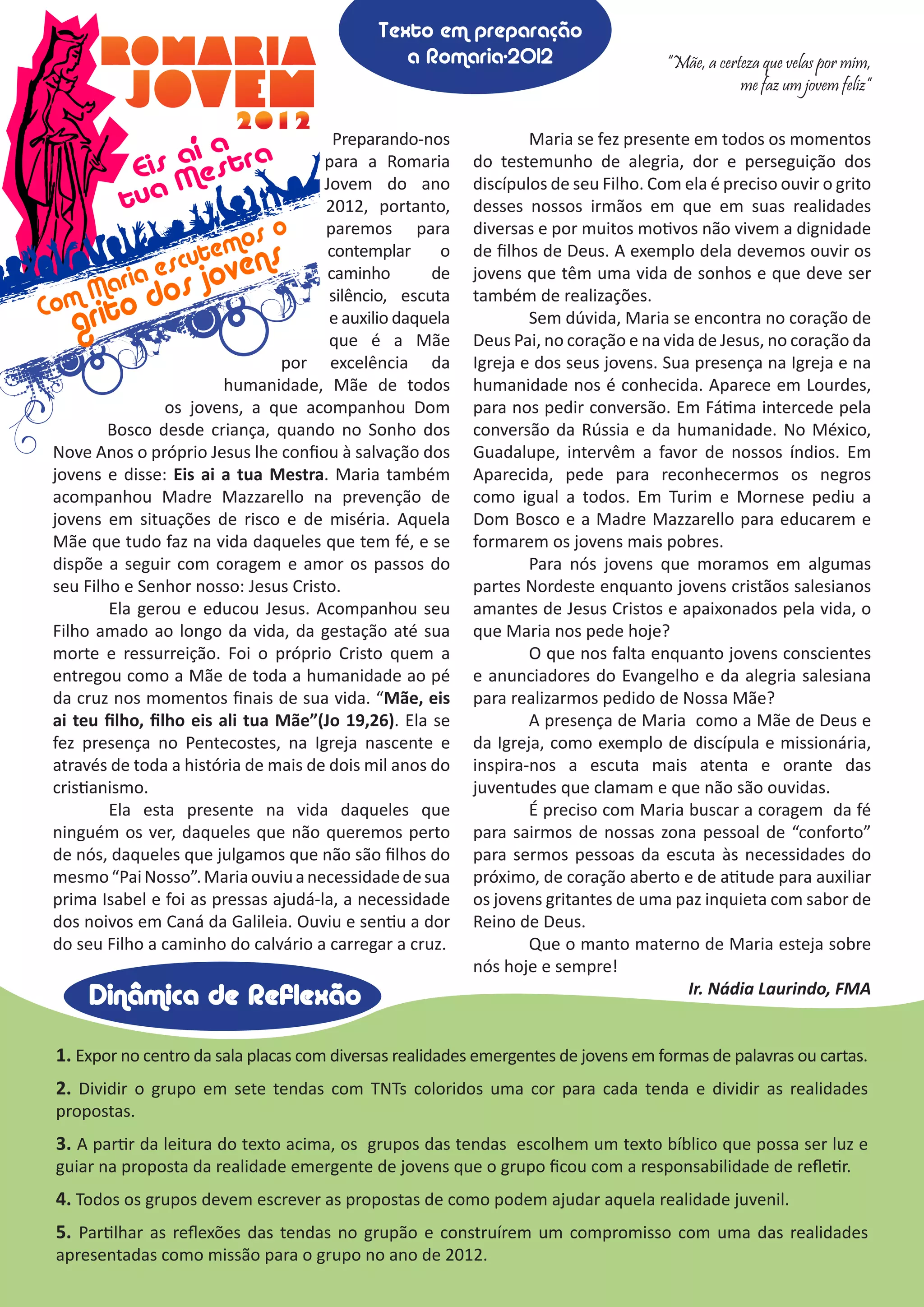 [1] O texto discute a importância de Maria na vida dos jovens e sua presença na Igreja e na humanidade. [2] Propõe uma dinâmica de reflexão em grupos sobre como ajudar jovens em situações difíceis à luz do exemplo de Maria. [3] O objetivo é que os participantes assumam o compromisso de ajudar uma realidade juvenil específica em 2012.