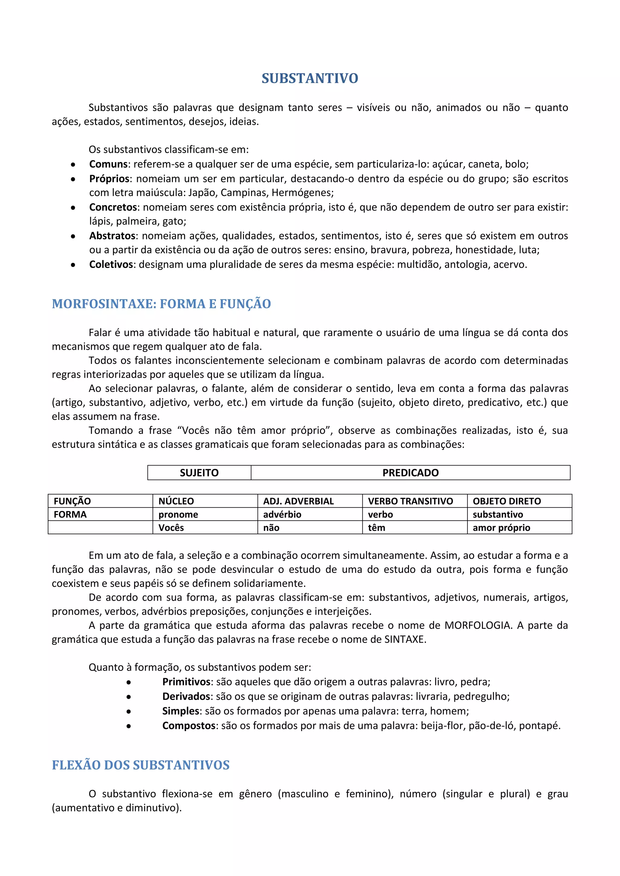 O documento discute as características e funções dos substantivos na língua portuguesa. Os substantivos são palavras que designam seres, ações, estados e ideias. Eles podem ser comuns ou próprios, concretos ou abstratos, simples ou compostos. Os substantivos flexionam em gênero, número e grau e podem assumir diferentes funções sintáticas na frase, como sujeito ou objeto. Os substantivos são essenciais para nomear entidades e organizar o pensamento.
