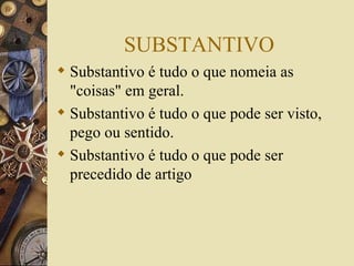 O documento discute as principais classificações dos substantivos em português, incluindo: substantivo comum vs próprio, concreto vs abstrato, primitivo vs derivado, simples vs composto e coletivo. Exemplos são fornecidos para cada classificação de substantivo. O documento também lista exercícios relacionados ao tema.