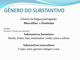 O documento discute os conceitos de gênero, número e grau dos substantivos na língua portuguesa. Apresenta regras gerais e exceções para a flexão de gênero entre masculino e feminino e para a formação do plural. Também explica o uso de sufixos aumentativos e diminutivos para indicar tamanho dos substantivos.