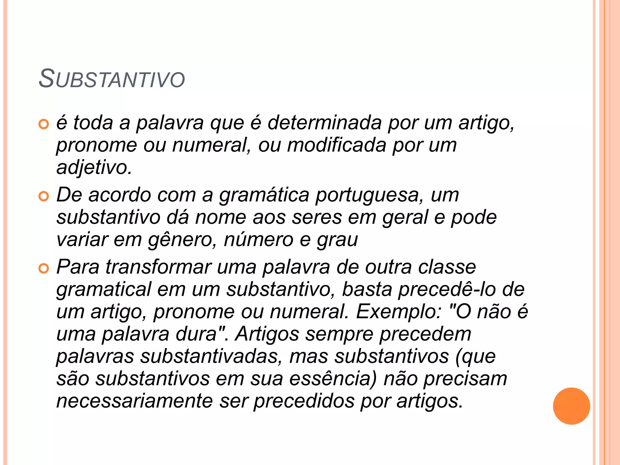 Substantivo é todaa palavra que é determinada por um artigo, pronome ou numeral, ou modificada por um adjetivo.De acordo com a gramática portuguesa, um substantivo dá nome aos seres em geral e pode variar em gênero, número e grauPara transformar uma palavra de outra classe gramatical em um substantivo, basta precedê-lo de um artigo, pronome ou numeral. Exemplo: "O não é uma palavra dura". Artigos sempre precedem palavras substantivadas, mas substantivos (que são substantivos em sua essência) não precisam necessariamente ser precedidos por artigos.