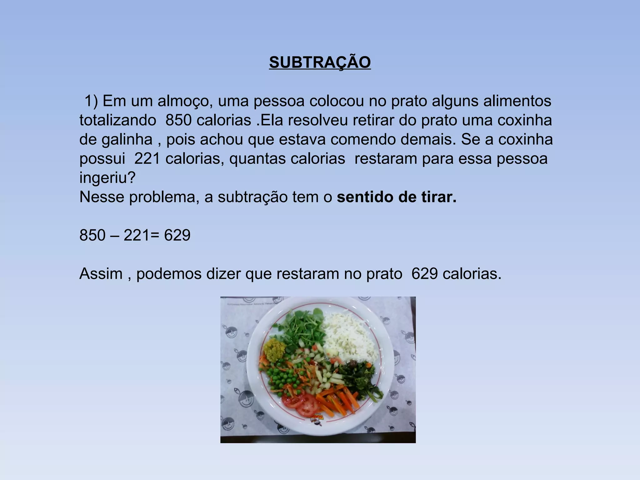 Uma pessoa comeu 850 calorias para o almoço, mas removeu 221 calorias de uma coxinha, deixando 629 calorias restantes. Uma pessoa deve comer 2500 calorias por dia, e até as 15h já havia comido 1800 calorias, deixando 700 calorias para comer até o fim do dia. Andréa comeu 2350 calorias e Tayná 1750 calorias no dia, então Andréa comeu 600 calorias a mais que Tayná.