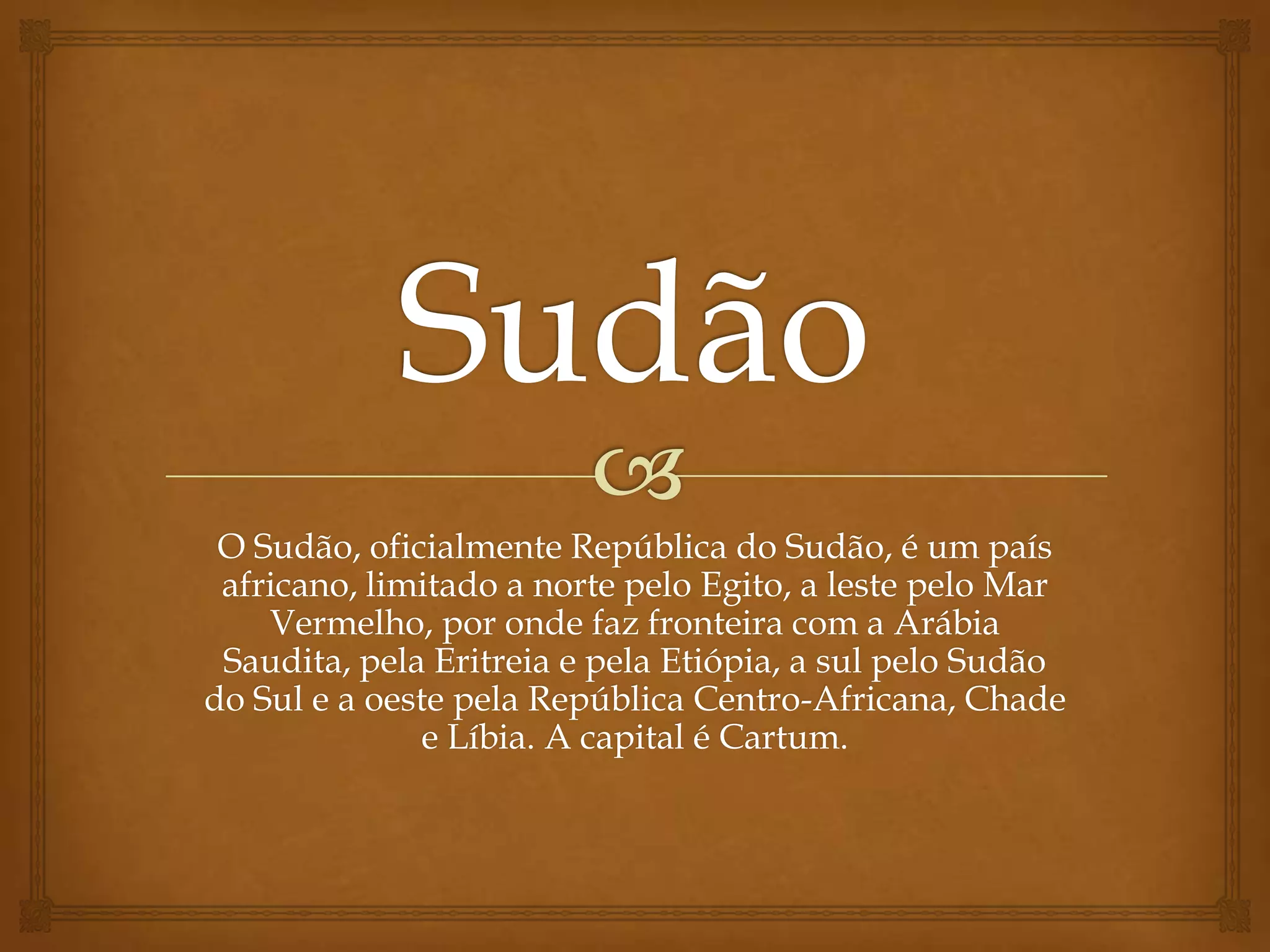 O Sudão é um grande país africano localizado no norte do continente. Limita-se ao norte pelo Egito, leste pelo Mar Vermelho, sul por vários países africanos e oeste por outros. Passou por um longo período de guerra civil entre o norte muçulmano e o sul não-muçulmano e recentemente o sul se tornou independente como o Sudão do Sul. A economia depende fortemente da agricultura e da exploração de petróleo.