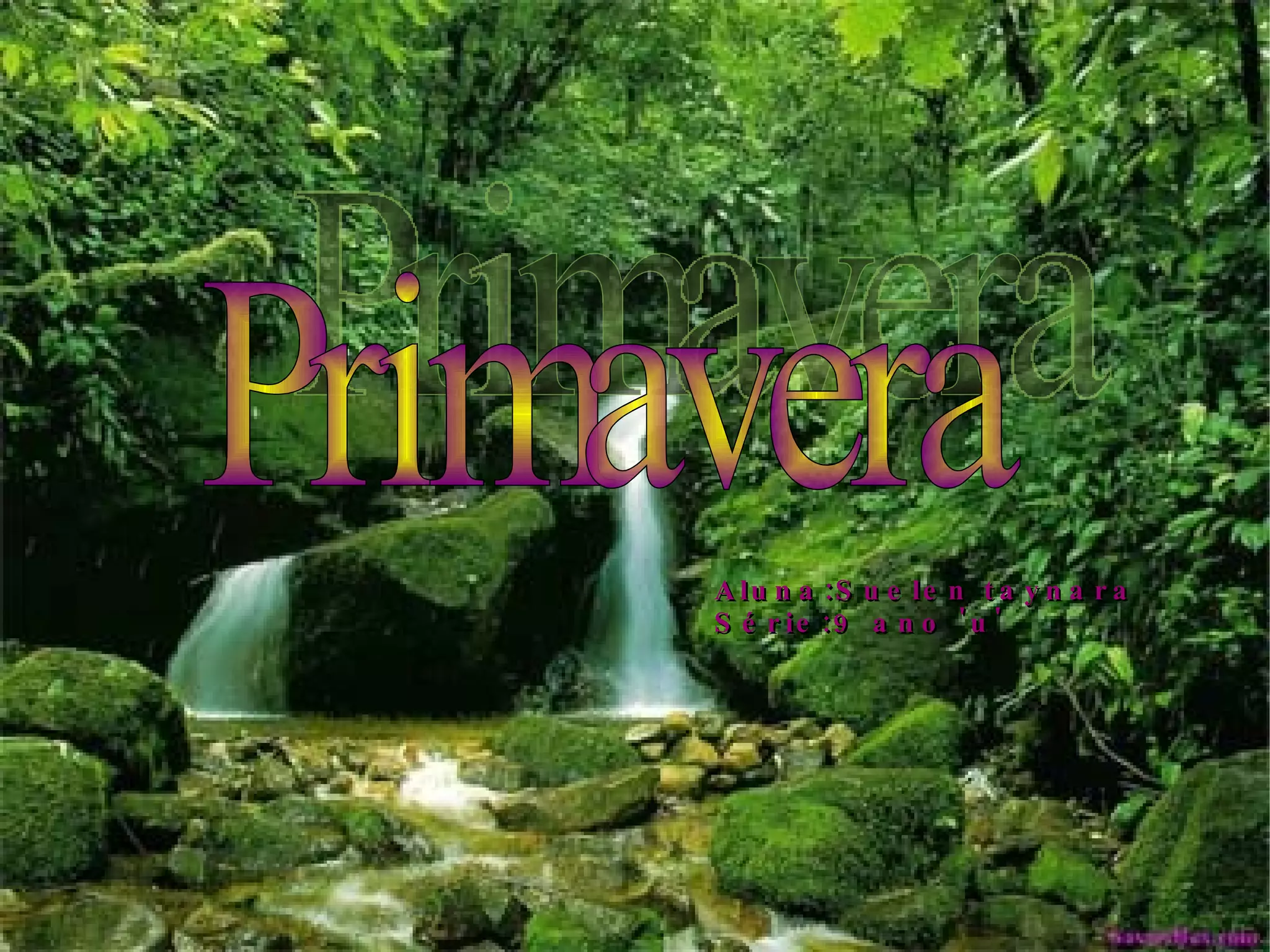 Lá vem elaPelas praças e jardins Sorridente e bela A primavera Com as chuvas criadeiras Resplandecendo nos canteiros Alegrando as brincadeiras Florescendo nos outeiros Sua brisa já posso sentir O aroma que trás lembrança Perfume que envolve a alma No colorido que da esperança Estação que alegra os olhos Estação que embeleza a terra Estação que acalanta e revela E inspira a escrita dos poetas É tempo de ver as “borboletas” É tempo de ouvir passarinhos É tempo de luz que revela A beleza da Primavera. (Autor descomhecido)