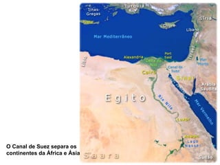 O Canal de Suez separa a África da Ásia, foi construído pelos franceses em 1869 e mede 163 km de comprimento, atravessando quatro lagos incluindo os Grandes e Pequenos Bitter Lakes.