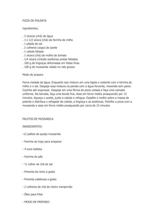 O documento fornece receitas de cinco pratos diferentes: suflê de legumes, frango assado com cebola crocante, pizza de polenta, palitos de mussarela e caviar de berinjela. As receitas incluem ingredientes e instruções de preparo detalhadas para cada prato.