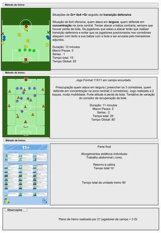 O documento descreve um plano de treino de futebol realizado com 21 jogadores. O treino incluiu exercícios de aquecimento, técnica individual, situações de posse de bola em espaço reduzido, situações táticas 6x4 e jogo formal 11x11. O objetivo era melhorar a mobilidade, posse de bola e transições defensivas da equipe.