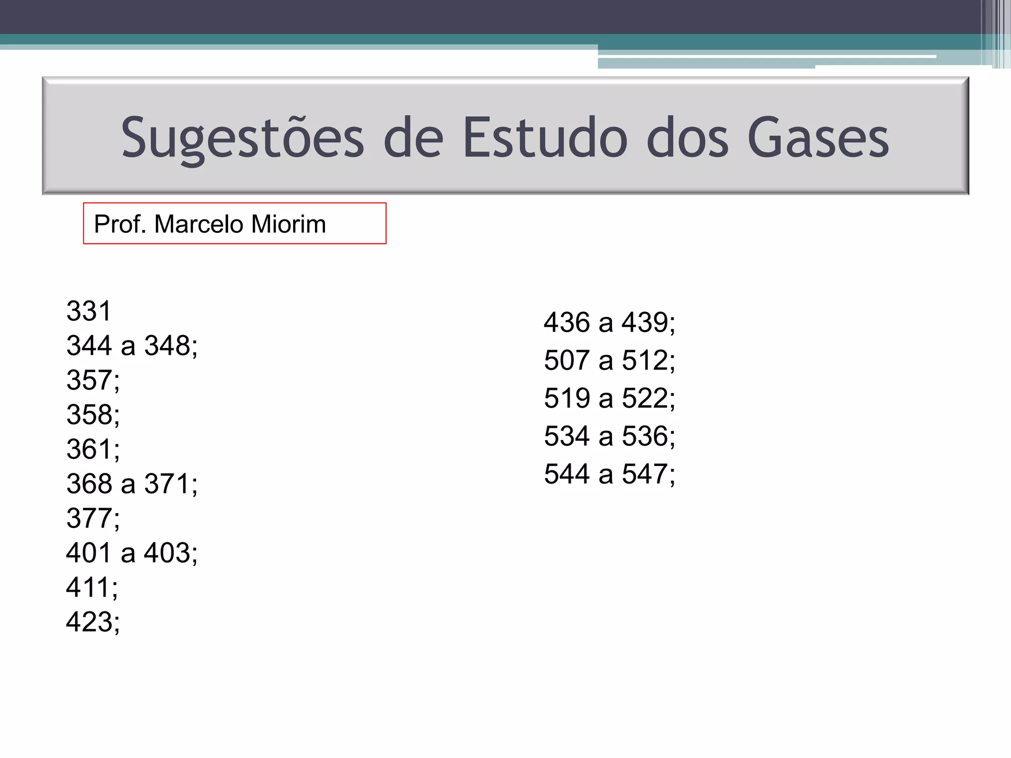Este documento fornece uma lista de páginas de um livro sobre gases, contendo números de páginas específicos para estudo. As páginas listadas contêm informações importantes sobre propriedades e comportamentos de gases.