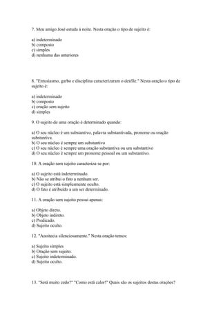 1) O documento contém 19 questões sobre identificação de sujeitos em orações, incluindo sujeitos ocultos, indeterminados, compostos e orações sem sujeito. As questões devem ser respondidas escolhendo entre as opções de resposta fornecidas.