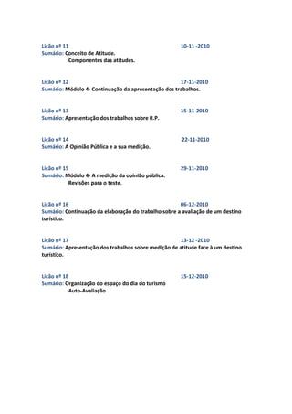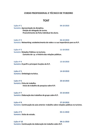 O documento descreve as lições de um curso profissional e técnico de turismo, cobrindo tópicos como relações públicas no turismo, perfil e funções de relações públicas, simbologia turística, pesquisa sobre relações públicas, atitudes, opinião pública, e avaliação e medição de destinos turísticos. Os alunos trabalharam em grupos para pesquisar esses tópicos e apresentar seus achados.