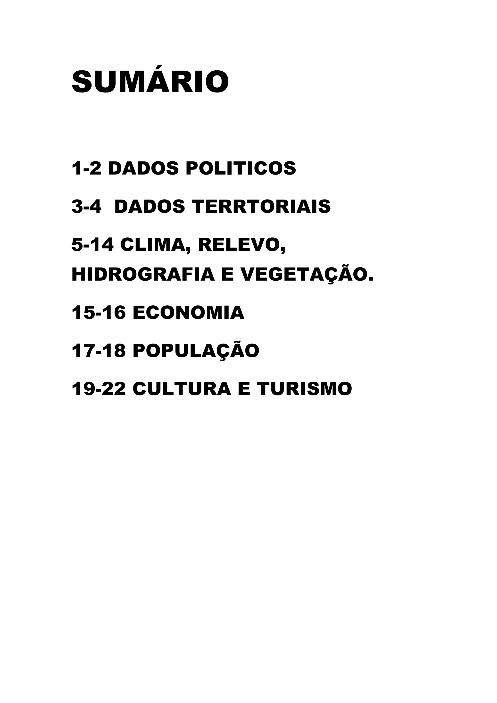 Este documento fornece um resumo de alto nível sobre um país ou região, dividido em seções sobre dados políticos e territoriais, clima, relevo, hidrografia e vegetação, economia, população e cultura e turismo.