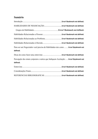 O documento discute as habilidades necessárias para a negociação, dividindo-as em três grupos: habilidades relacionadas a pessoas, problemas e decisões. Ele também fornece dicas para entrevistas eficazes, como perceber sinais corporais que indiquem aceitação.