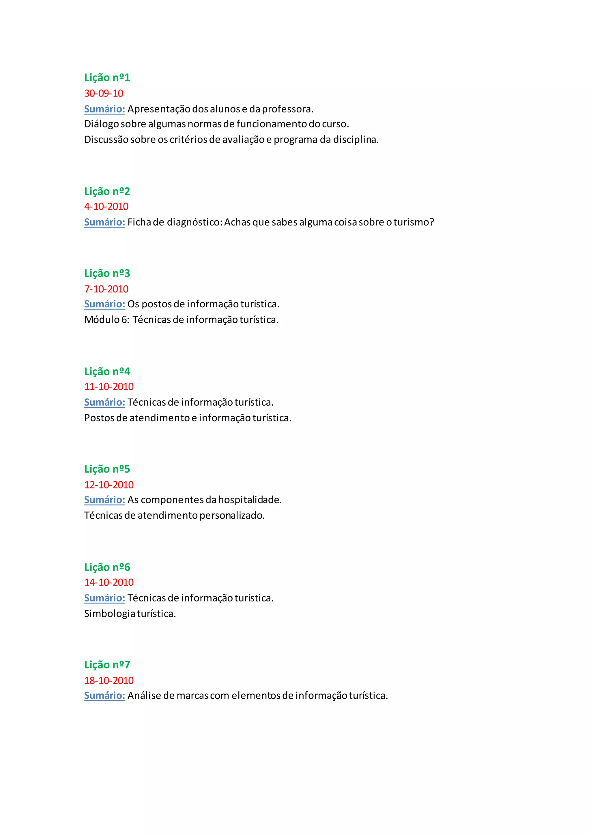 O documento apresenta um resumo de 19 lições sobre técnicas de informação turística, incluindo apresentações de alunos e professores, discussões sobre critérios de avaliação, fichas de diagnóstico, postos de informação turística, hospitalidade, simbologia turística e marcas, elaboração e apresentação de trabalhos sobre o tema, e introdução de um novo módulo sobre itinerários e destinos turísticos.