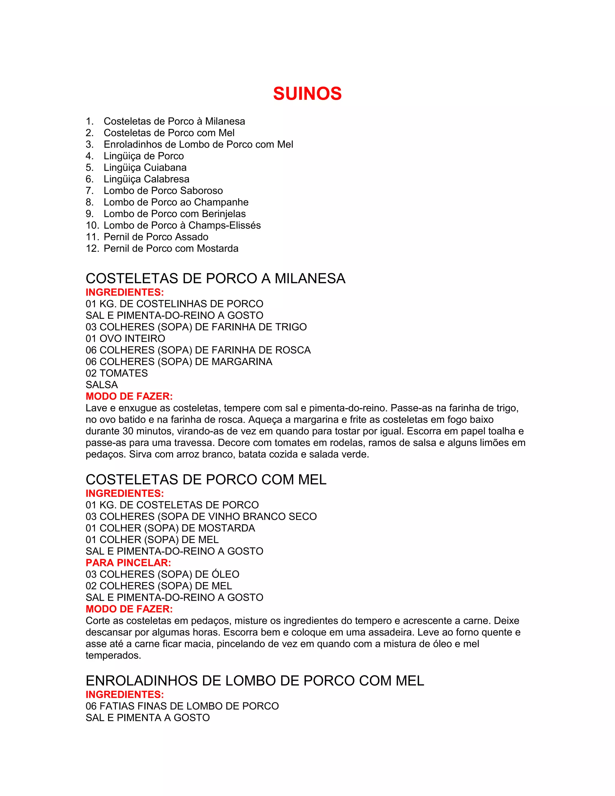 O documento lista 12 receitas de suínos, incluindo costeletas de porco, lombo de porco, pernil de porco e lingüiças. As receitas fornecem instruções detalhadas sobre ingredientes e modo de preparo para pratos populares feitos com diferentes cortes de carne suína.