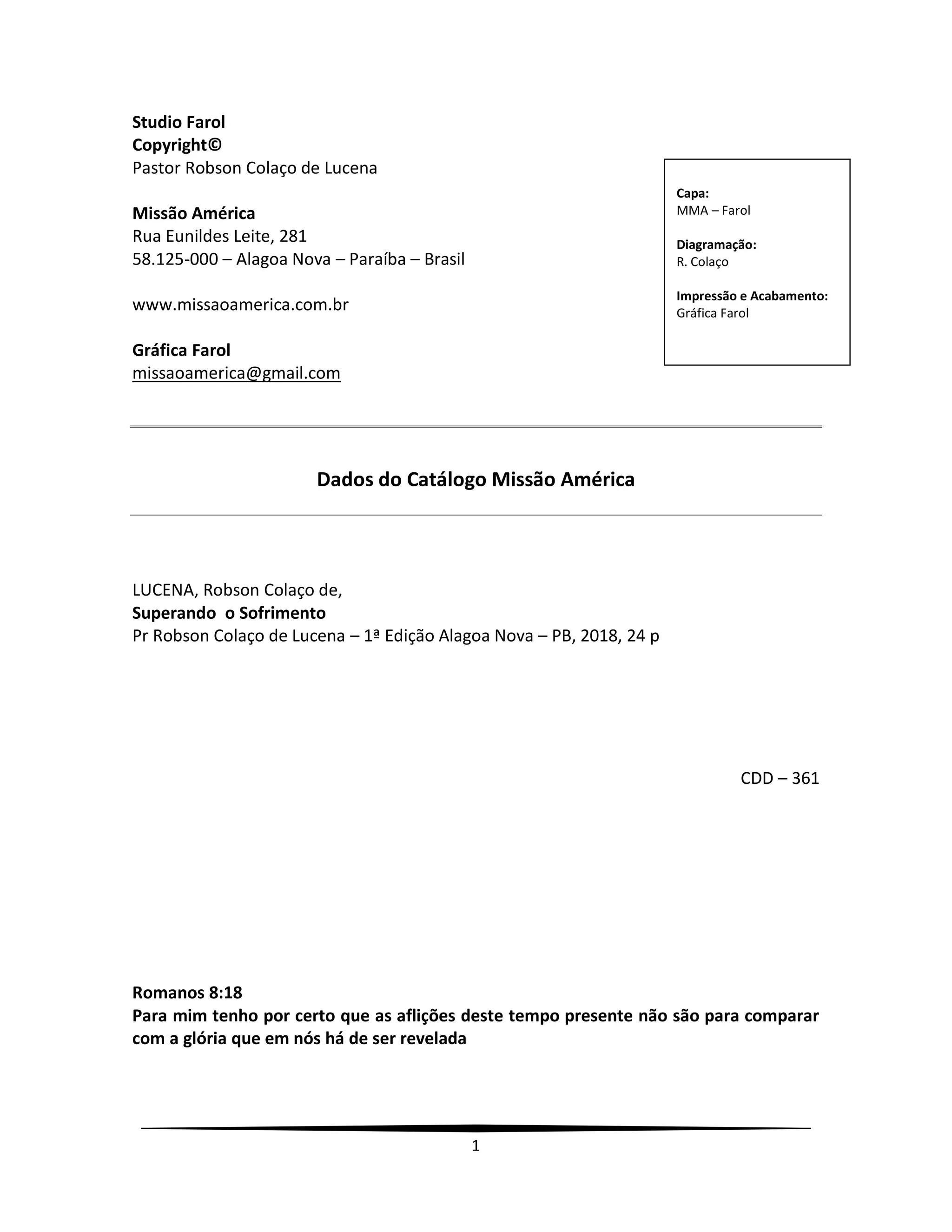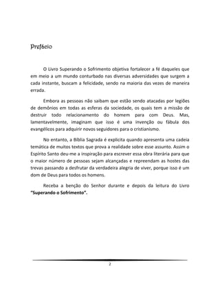 O documento discute como o sofrimento pode ser superado através da fé em Deus. Ele explica que o pecado causa sofrimento e que Jesus é capaz de libertar as pessoas da aflição. Também afirma que as adversidades podem trazer experiência e força para lidar com desafios futuros, desde que se busque a perfeição em Deus.