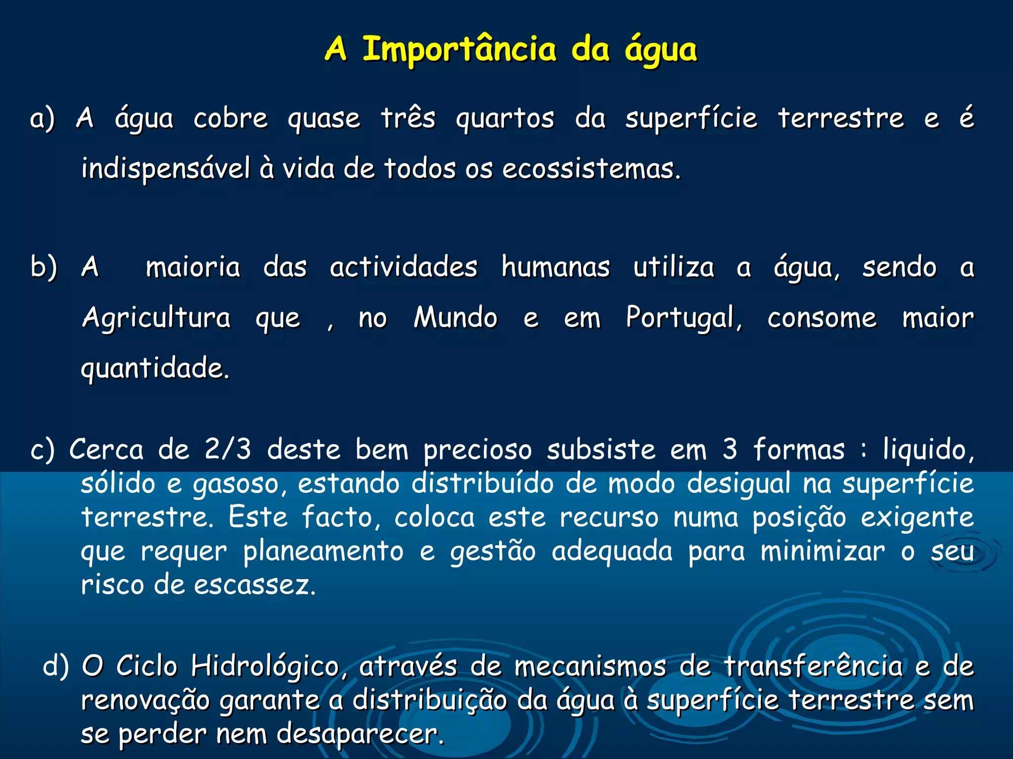 O documento discute a importância da água, como ela cobre grande parte da Terra e é essencial para a vida. A maioria das atividades humanas, especialmente a agricultura, dependem da água. A água existe em três formas e é distribuída de forma desigual, exigindo planejamento para evitar escassez. O ciclo hidrológico renova e distribui a água através de mecanismos de transferência.