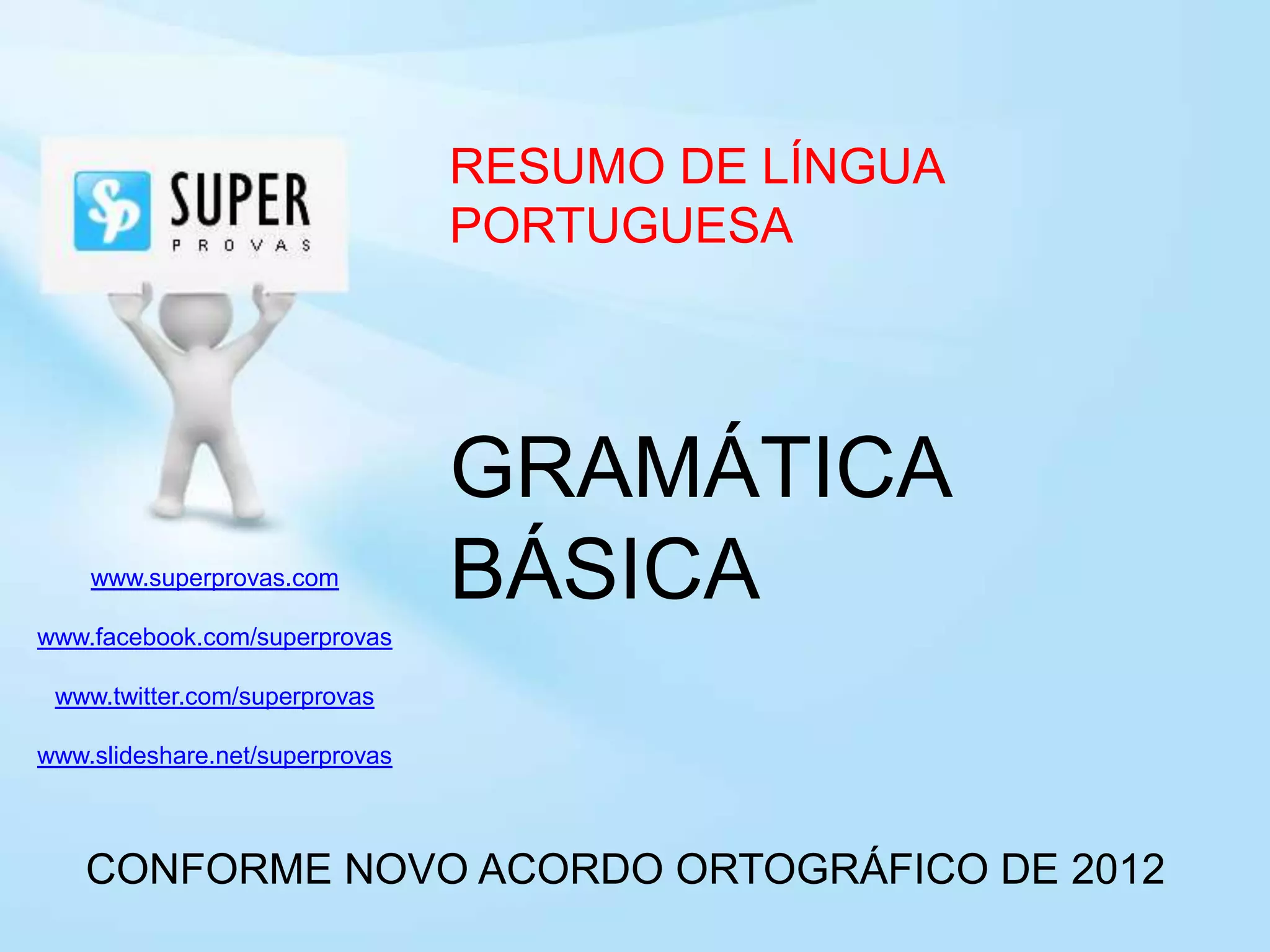 O documento resume conceitos básicos de gramática da língua portuguesa, incluindo: