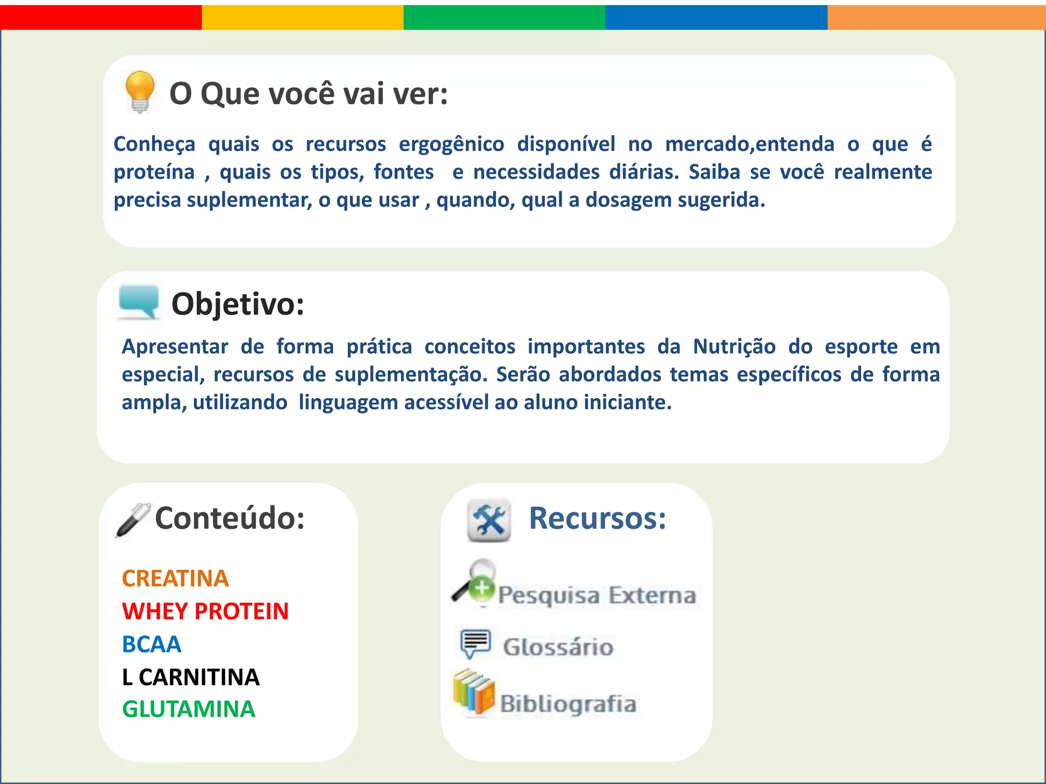O documento fornece informações sobre suplementação antes, durante e depois do treino. Ele discute os benefícios e uso recomendado de proteínas, creatina, BCAAs, L-carnitina e glutamina, incluindo doses diárias sugeridas. O documento também aborda questões como indicações de suplementação, diferenças entre suplementos e anabolizantes, e cuidados ao usar suplementos.
