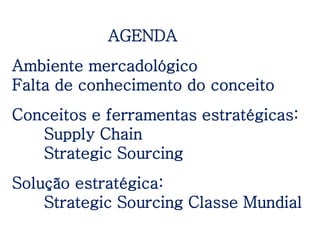 O documento discute a falta de conhecimento sobre supply chain e strategic sourcing, destacando a importância dessas áreas para a produtividade e competitividade das empresas. Apresenta conceitos e ferramentas estratégicas, enfatizando um processo colaborativo e baseado em dados para melhorar as aquisições. Além disso, propõe um alinhamento entre as estratégias de suprimentos e os objetivos corporativos para alcançar excelência em sourcing e gestão de riscos.