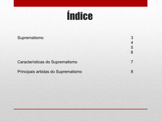 O documento descreve o movimento artístico Suprematismo e seus principais artistas, incluindo Kazimir Malevich, El Lissitzky, Liubov Popova e Ivan Puni. Ele discute as características do Suprematismo e fornece informações biográficas sobre os principais artistas desta corrente.