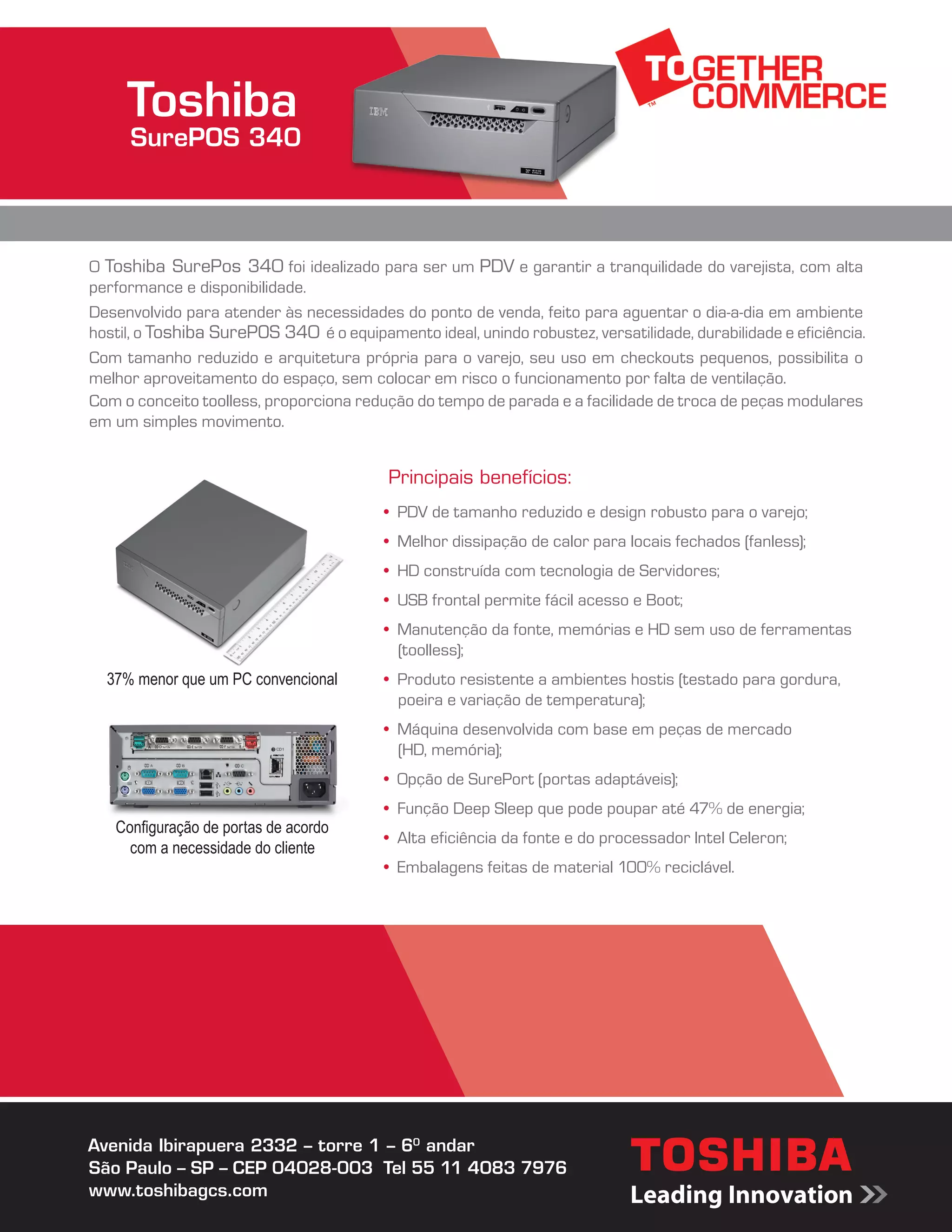 O documento descreve o Toshiba SurePos 340, um PDV projetado para o varejo com alta performance, disponibilidade e resistência a ambientes hostis. Ele possui tamanho reduzido, dissipação de calor melhorada, manutenção simplificada e baixo consumo de energia para proporcionar maior eficiência e redução de custos aos varejistas. O documento lista as especificações técnicas e recursos do equipamento, incluindo processador, memória, portas, dimensões, periféricos compatíveis e suporte oferecido.