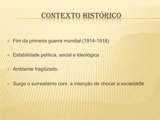 O surrealismo, surgido na década de 1920 em Paris, busca explorar o inconsciente e os sonhos, sendo influenciado pelas ideias de Freud e o dadaísmo. Principais figuras incluem André Breton, Salvador Dalí, e Joan Miró, cuja arte rompe com a lógica tradicional e utiliza elementos oníricos. O movimento também teve impacto no Brasil na década de 1930, com artistas como Mário de Andrade e Tarsila do Amaral incorporando suas ideias.