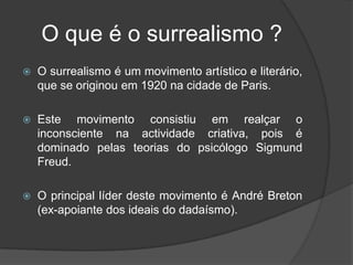 O surrealismo foi um movimento artístico e literário que se originou em Paris na década de 1920, influenciado pelas teorias psicológicas de Freud sobre o inconsciente. Liderado por André Breton, valorizava o automatismo e as associações livres para expressar o funcionamento do pensamento sem controle da razão. Artistas como Dali, Magritte e Miró tornaram-se célebres por retratar o espaço interior da mente humana por meio de imagens abstratas e oníricas.