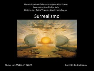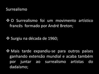 O documento discute o movimento artístico surrealista, incluindo que foi fundado por André Breton na década de 1920, foi influenciado pelas teorias de Freud sobre o inconsciente, e caracterizado por combinar elementos irreais e abstratos com o figurativo.