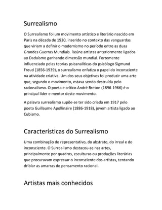 O Surrealismo surgiu em Paris na década de 1920 influenciado pelo Dadaísmo e pelas teorias psicanalíticas de Freud, enfatizando a expressão do inconsciente. Liderado por André Breton, valorizava a combinação do representativo, abstrato, irreal e inconsciente nas artes. Artistas fundamentais foram Salvador Dalí, conhecido por imagens oníricas e bizarras, e Joan Miró, escultor e pintor surrealista catalão.