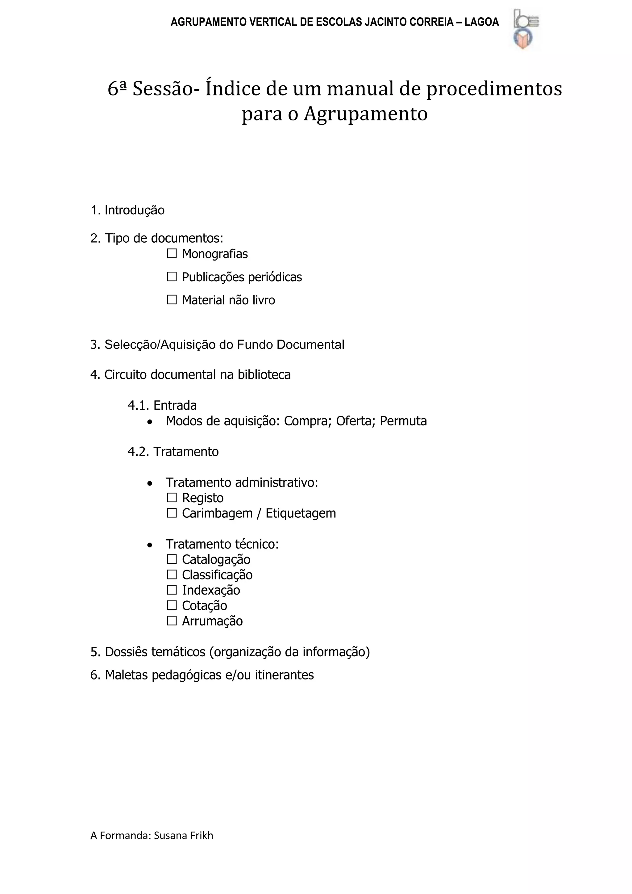 O documento apresenta um índice para um manual de procedimentos para uma biblioteca, descrevendo os tipos de documentos, a seleção e aquisição do acervo, o fluxo de processamento dos itens desde a entrada até a organização e armazenamento, incluindo catalogação, classificação e indexação, e menciona dossiês temáticos e maletas pedagógicas para disseminação da informação.