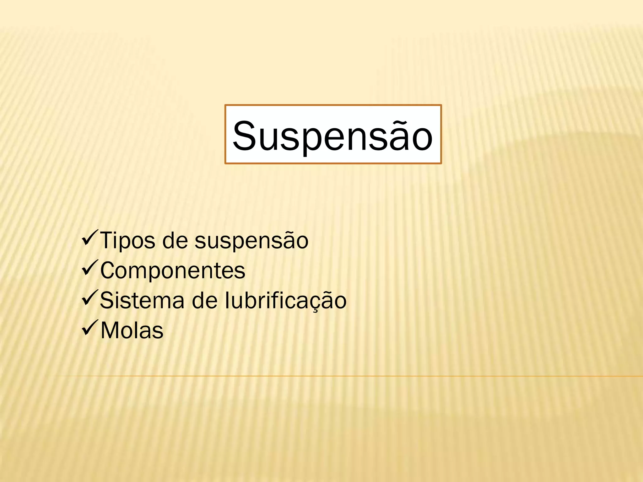 O documento discute diferentes tipos de suspensão de veículos, incluindo suspensões dependentes, independentes e semi-independentes. Ele também descreve os principais componentes de uma suspensão, como amortecedores, molas, articulações esféricas e barras estabilizadoras. Finalmente, fornece detalhes sobre molas helicoidais, feixes de molas e outras características de suspensões.