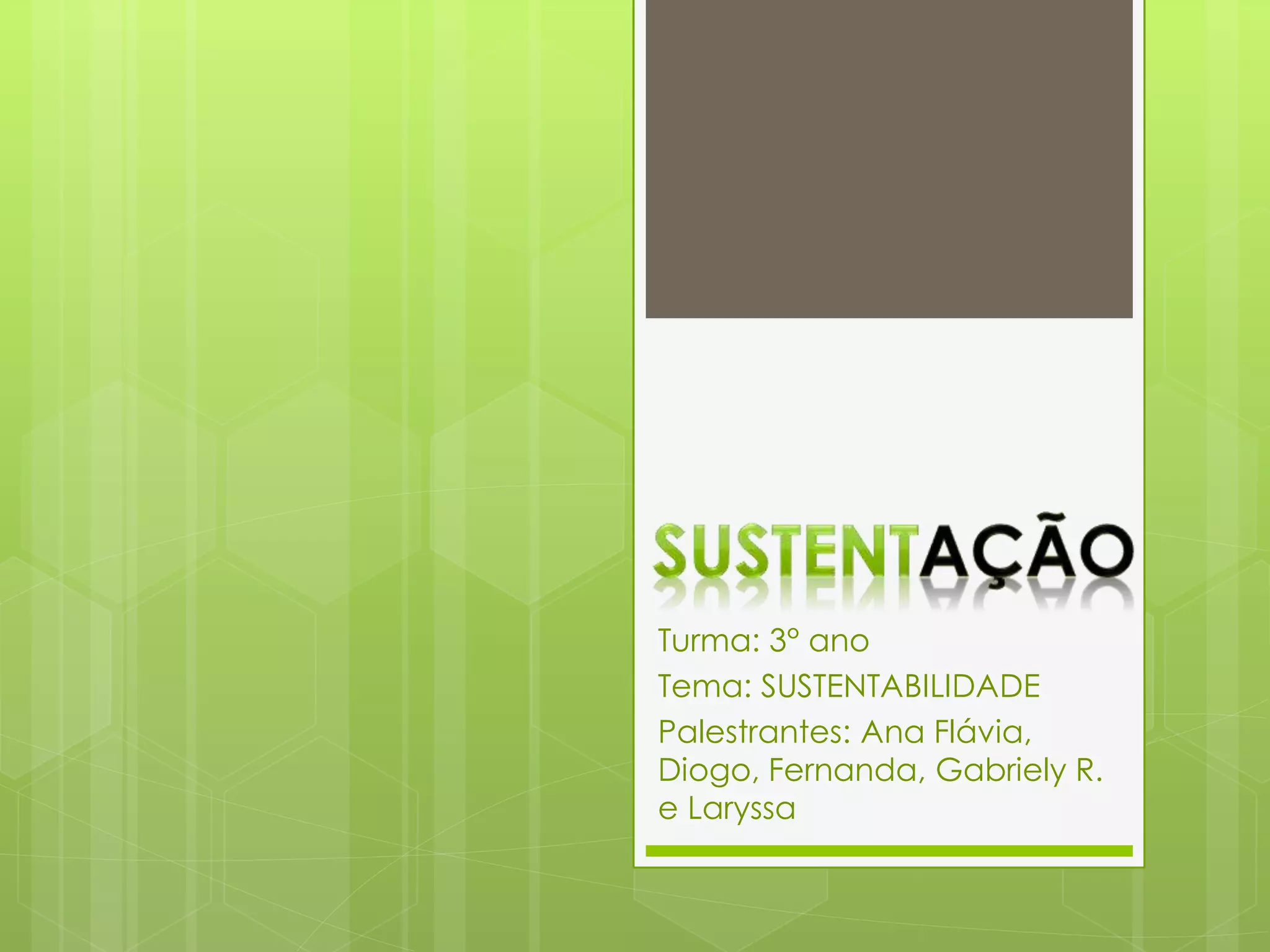 O documento apresenta os tópicos discutidos por estudantes sobre sustentabilidade, incluindo: o que é sustentabilidade, a importância da reciclagem, reutilização de materiais, economia de energia, reaproveitamento da água, compostagem, construção sustentável e como alcançar um mundo mais sustentável.