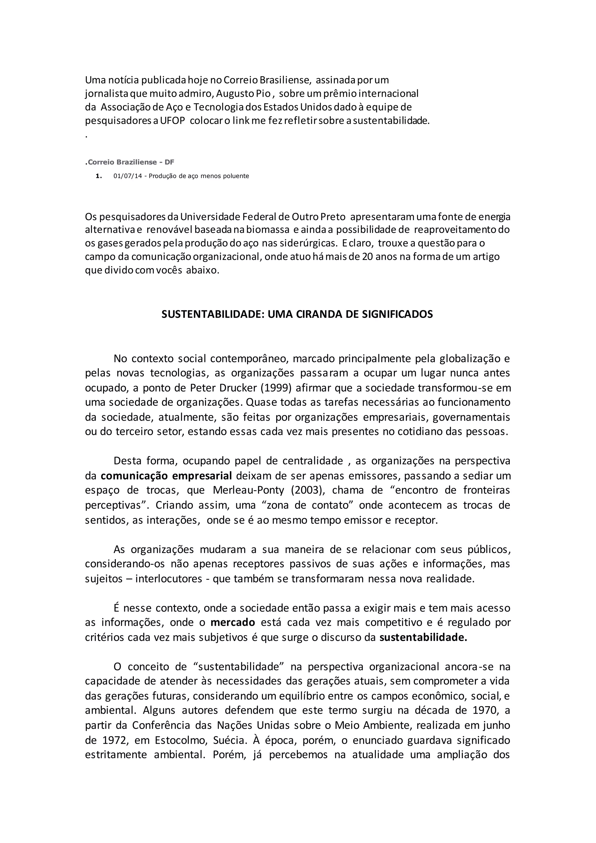 O documento discute a sustentabilidade no contexto organizacional e como o conceito tem significados ampliados. Ele também analisa como as organizações usam o discurso da sustentabilidade para legitimar suas atividades e gerar capital simbólico, enquanto seus públicos se apropriam do discurso pela perspectiva da responsabilidade social. O autor conclui que comunicar envolve estratégias discursivas que criam uma "ciranda de sentidos" entre as organizações e seus públicos.